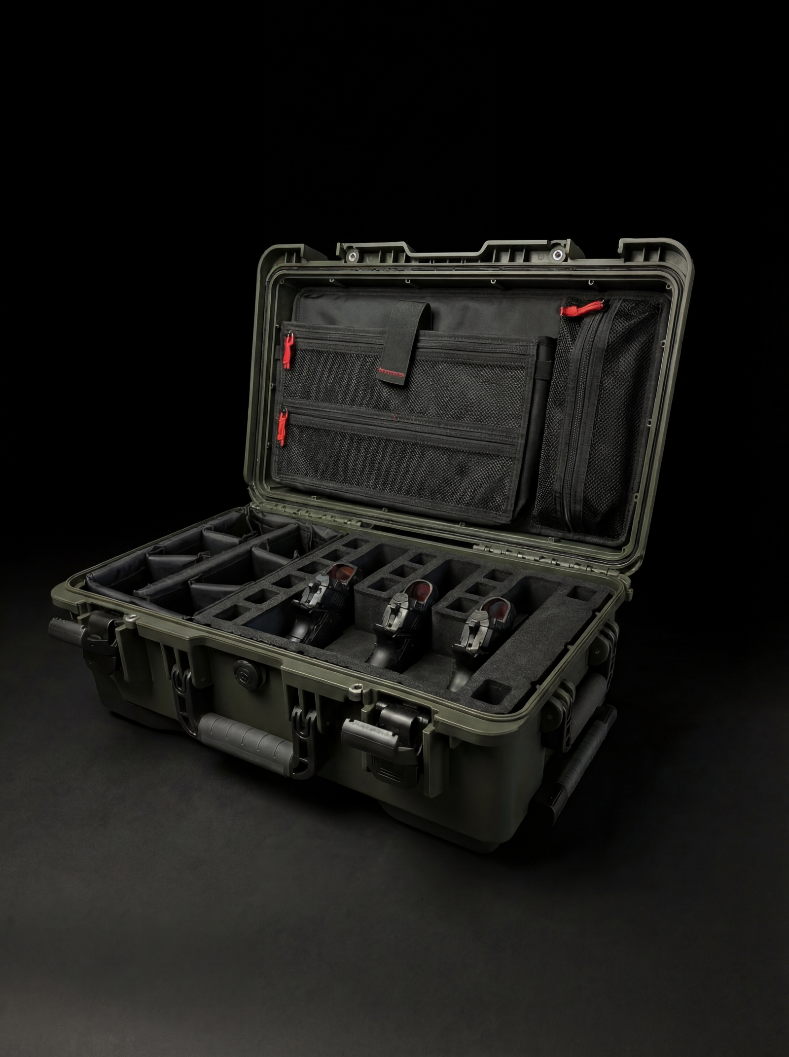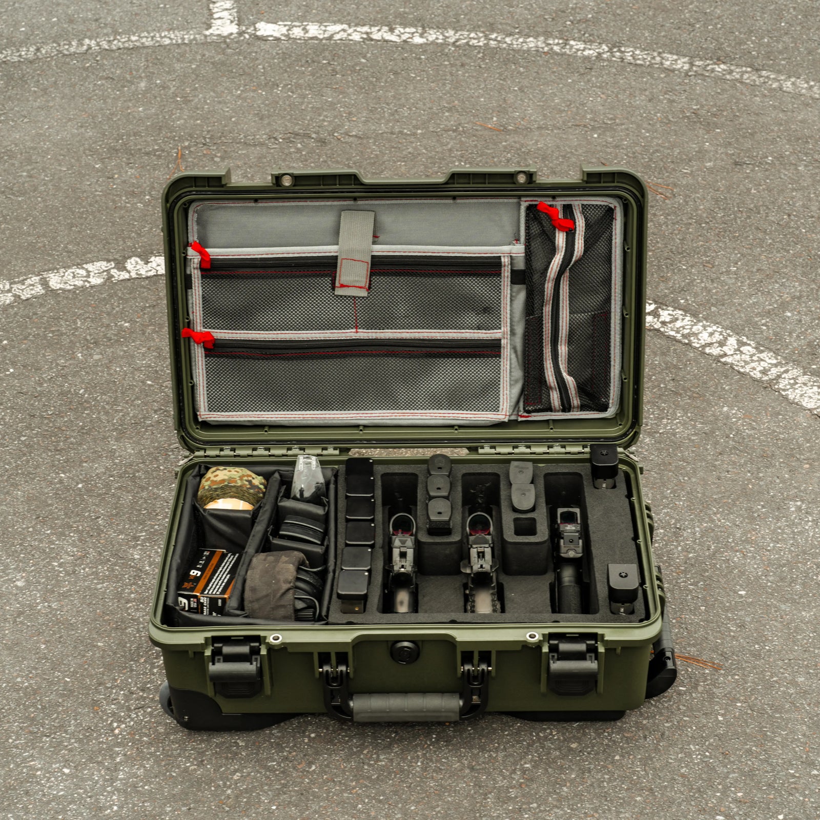 Stage at home, roll through security, deploy at the range—no repacking required. The case opens into your workstation. Magazines stand ready. Ammo stays organized. Tools visible. Same layout, same confidence, same result.